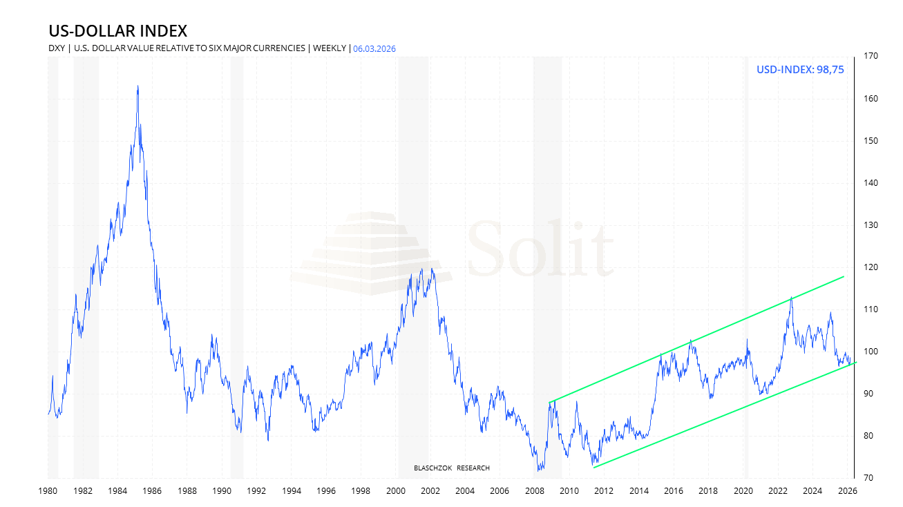 Diese Gemengelage aus einem steigenden Rohölpreis, Dollarstärke, steigenden Zinsen, niedrigeren Zinssenkungserwartungen und einer möglicherweise durch einen Ölpreisschock getriggerten Rezession brachte die Edelmetalle in der letzten Handelswoche unter Verkaufsdruck. Insbesondere die industriell genutzten Weißmetalle Silber, Platin und Palladium gaben stark nach, da diese in einer Rezession aufgrund des Einbruchs der industriellen Nachfrage zyklisch stark im Preis fallen würden. In dem aktuellen Umfeld bei einem weiteren Anstieg des US-Dollar auf 105 Punkte im USDX (DXY) wäre eine weitere Korrektur des Goldpreises unter die Marke von 5.000 US-Dollar bis mindestens 4.700 US-Dollar wahrscheinlich. Trader und Investoren sollten daher aktuell den US-Dollar sowie den Rohölpreis im Auge behalten und bei einem Ausbruch des USDX über 100 Punkte nach einem kurzfristigen Short-Signal am Gold- und Silbermarkt Ausschau halten.