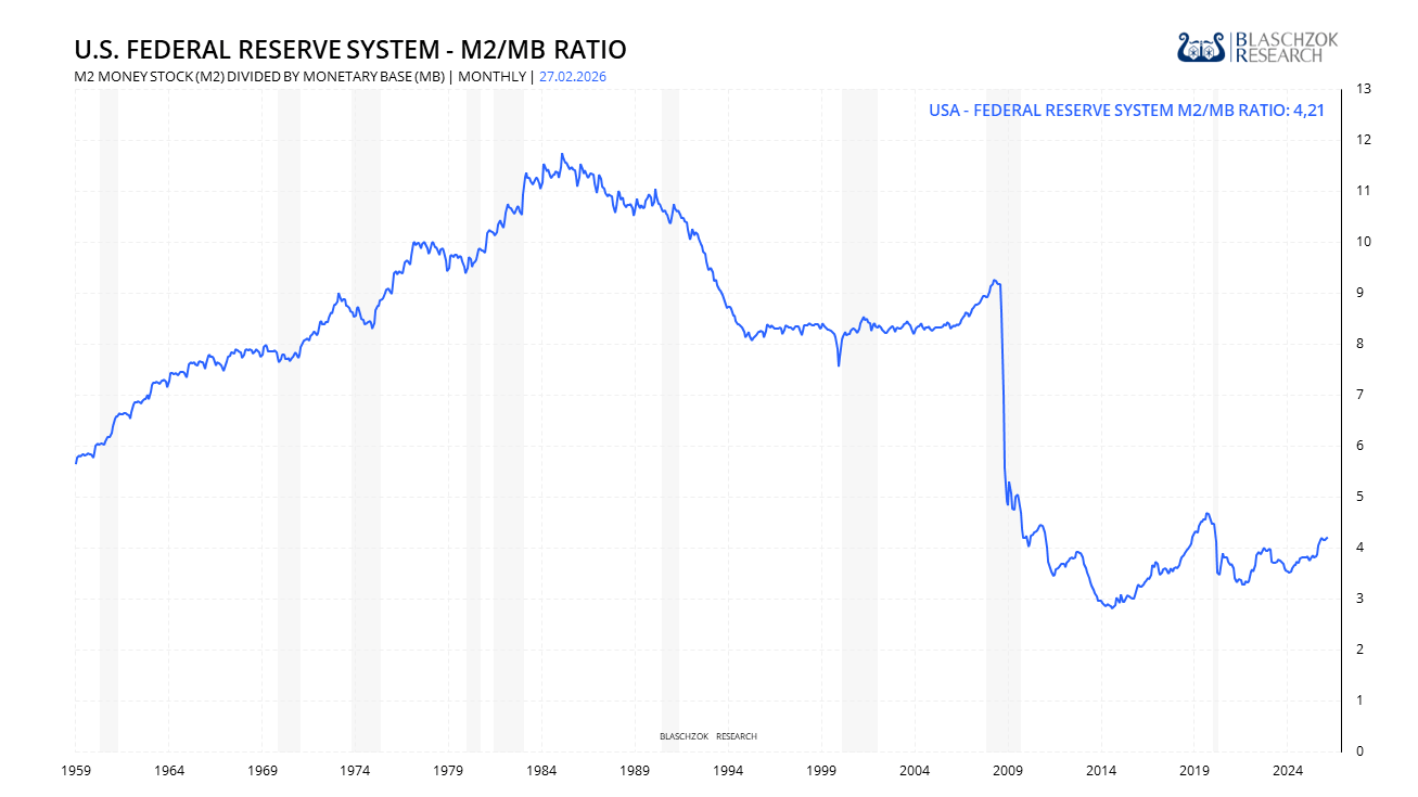 Ebenso hatte ich mehrfach dargelegt, dass die Fed nicht zwingend erneut die Gelddruckerpresse anwerfen muss. Mit den QE-Programmen der vergangenen zwei Jahrzehnte wurde das Bankensystem bereits zur Genüge rekapitalisiert. Das Verhältnis von M2 zur Geldbasis zeigt deutlich, dass das System heute nicht mehr so stark gehebelt ist wie in früheren Krisen. Anders als damals droht in einer deflationären Rezession deshalb nicht automatisch ein unmittelbarer Kollaps des Bankensystems. Im Gegenteil könnte man dem System spürbar Luft entziehen und auch die Aktienmärkte über längere Zeit fallen lassen, ohne dass sofort das gesamte Kreditgefüge zerbricht.
