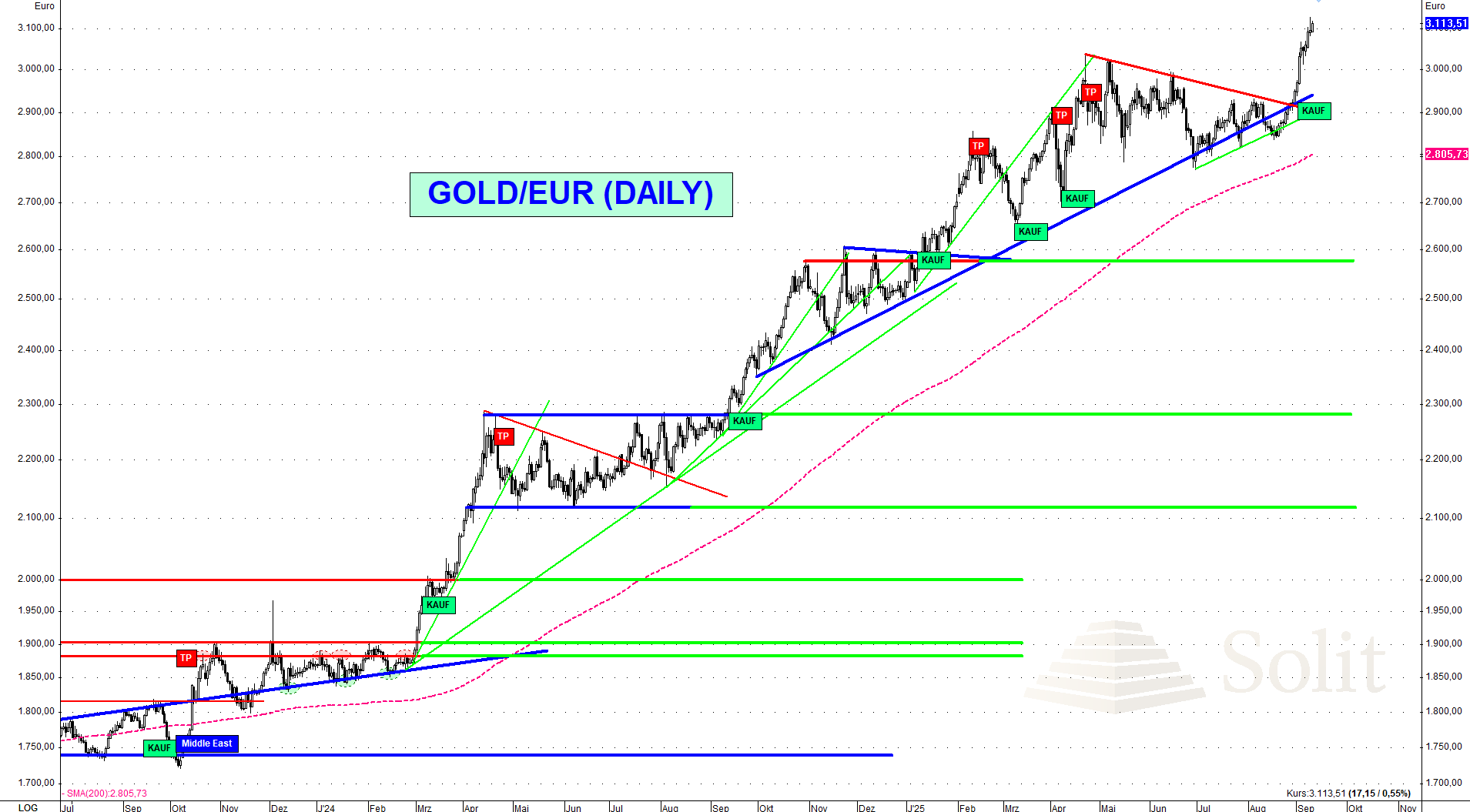 Der Goldpreis in Euro keilte sich seit Mai innerhalb eines korrektiven Abwärtstrends und eines mittelfristigen Aufwärtstrends zunehmend ein. Anstatt den Aufwärtstrend zu brechen und zu korrigieren, was nach der starken Rallye der letzten anderthalb Jahre nicht verwunderlich gewesen wäre, brach dieser stattdessen nach oben aus und gab ein erneutes Kaufsignal mit einem Potenzial von 200-400 Euro nach oben. Solange sich der Preis über der Marke von 2.900 Euro (3.400 US-Dollar) hält, bleibt das Kaufsignal intakt und das Chartbild sehr bullisch. Die Rallye könnte sich fortsetzen bis der Goldpreis in US-Dollar die runde Marke bei 4.000 US-Dollar erreicht hat, wobei begrenzte Korrekturen drohen, sobald Aufwärtstrends oder wichtige Unterstützungen brechen.