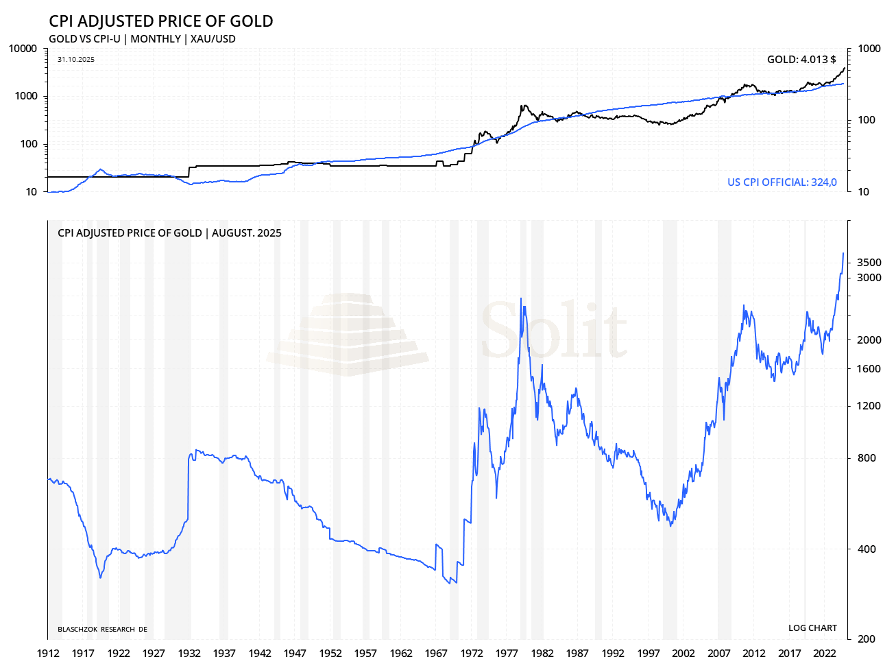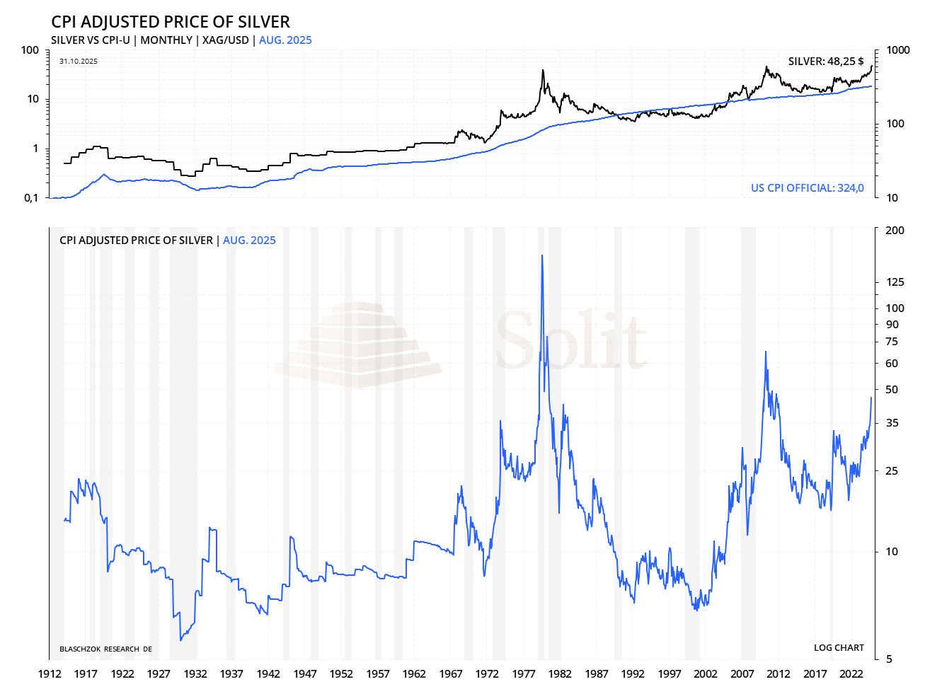 Gold hingegen hat sein reales Hoch von 1980 bei 2.780 US-Dollar bereits deutlich übertroffen. Aber auch Gold ist aktuell keineswegs „zu teuer“, da die offiziellen Inflationszahlen nicht die reale Geldentwertung abbilden und das reale inflationsbereinigte Hoch noch deutlich höher liegt.