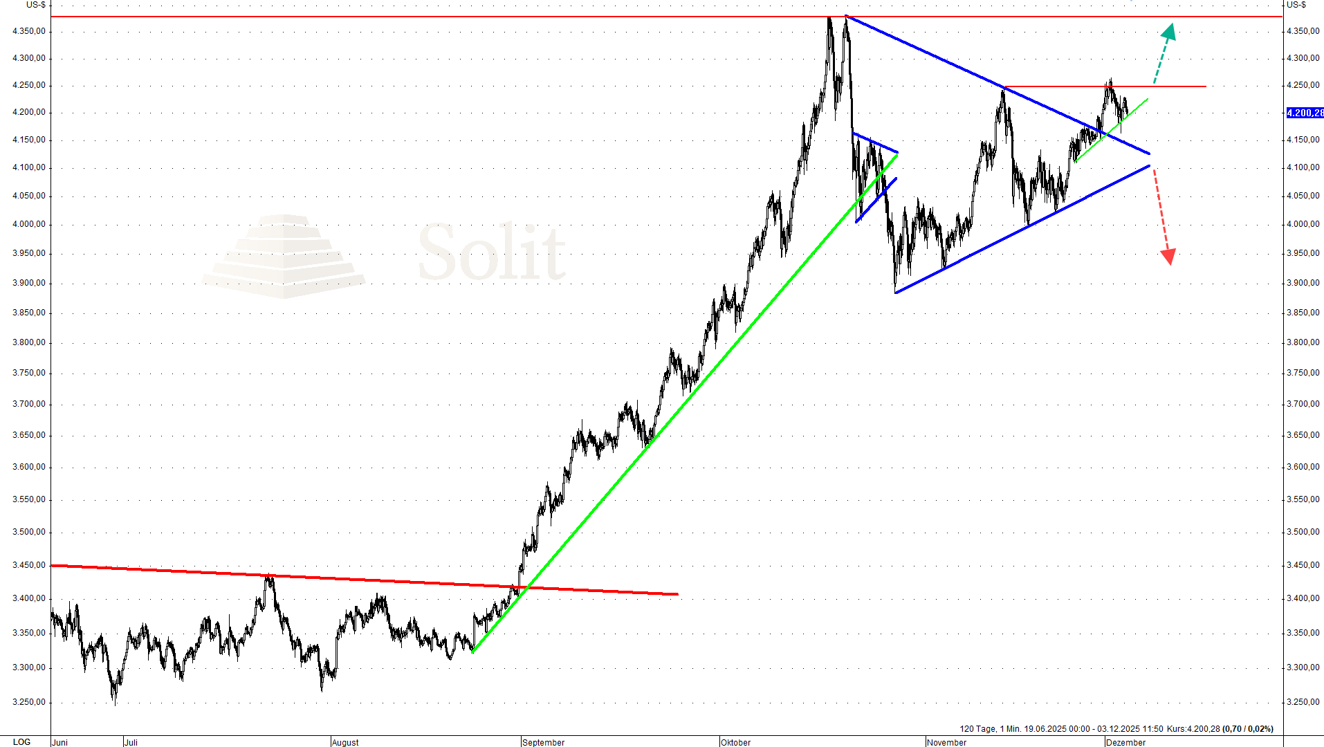 Der Bereich um 4.175 US-Dollar bleibt die zentrale Zone, an der sich entscheidet, ob der Ausbruch nach oben Bestand hat und ein weiterer Anlauf in Richtung des Allzeithochs bei rund 4.400 US-Dollar möglich bleibt oder ob der Goldpreis wieder in den alten Abwärtstrend zurückfällt und die Korrekturszenarien mit 3.700 US-Dollar und 3.450 US-Dollar wieder in den Vordergrund rücken.