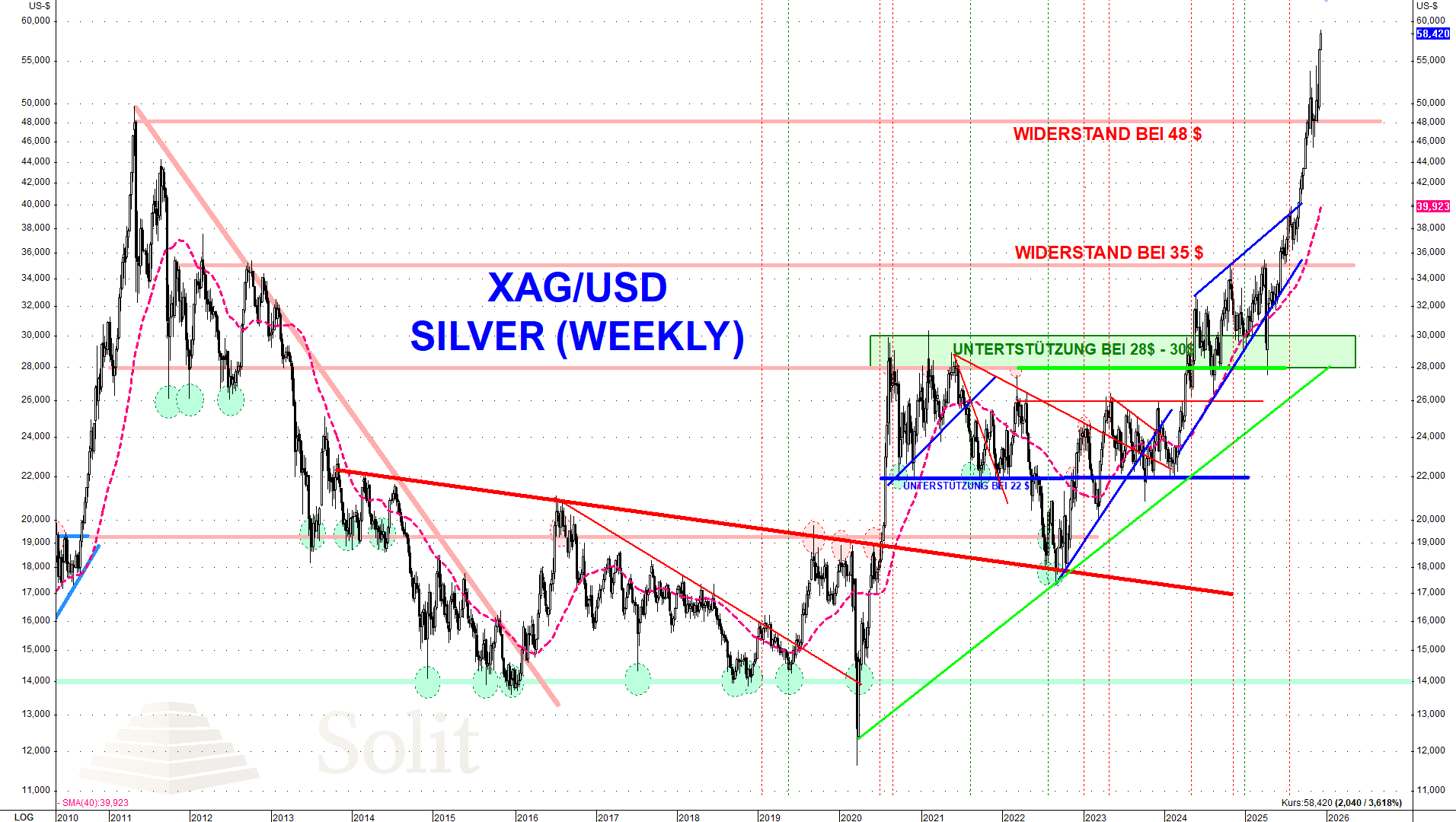 Das Kaufsignal mit dem Ausbruch über den Abwärtstrend brachte den erwarteten Anstieg bis zum nächsten Widerstand mit einem neuen Verlaufshoch bei 4.264 US-Dollar im Goldpreis, während Silber einen Profit von 6 US-Dollar brachte, bevor der Markt auf aktuell etwa 58 US-Dollar zurückkam. Solange der Goldpreis über seinem Abwärtstrend handelt, bleibt das Chartbild langfristig aufwärtsgerichtet, ebenso beim Silberpreis oberhalb seines Allzeithochs.