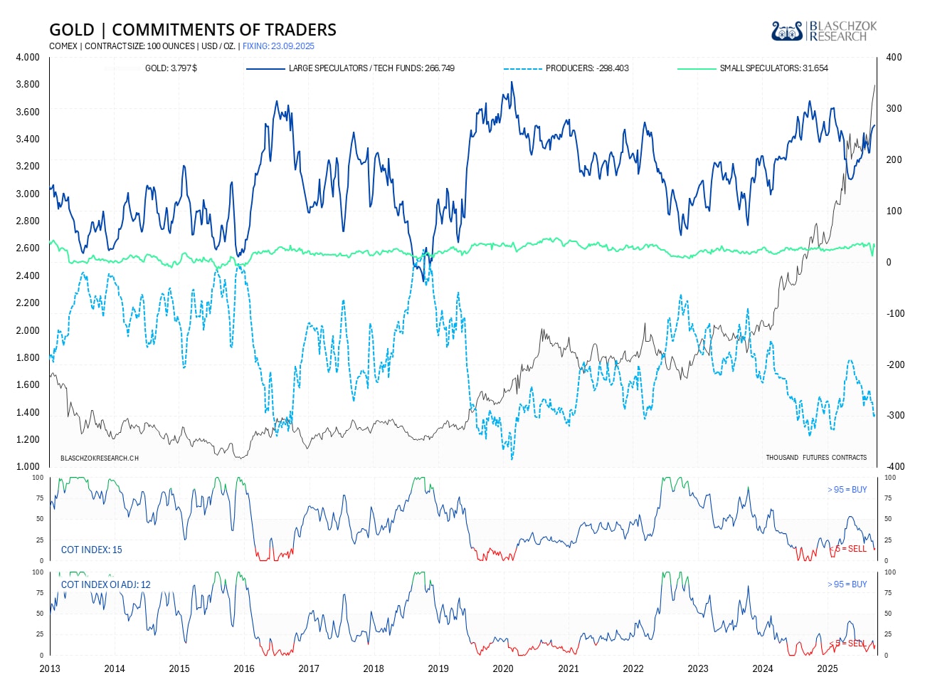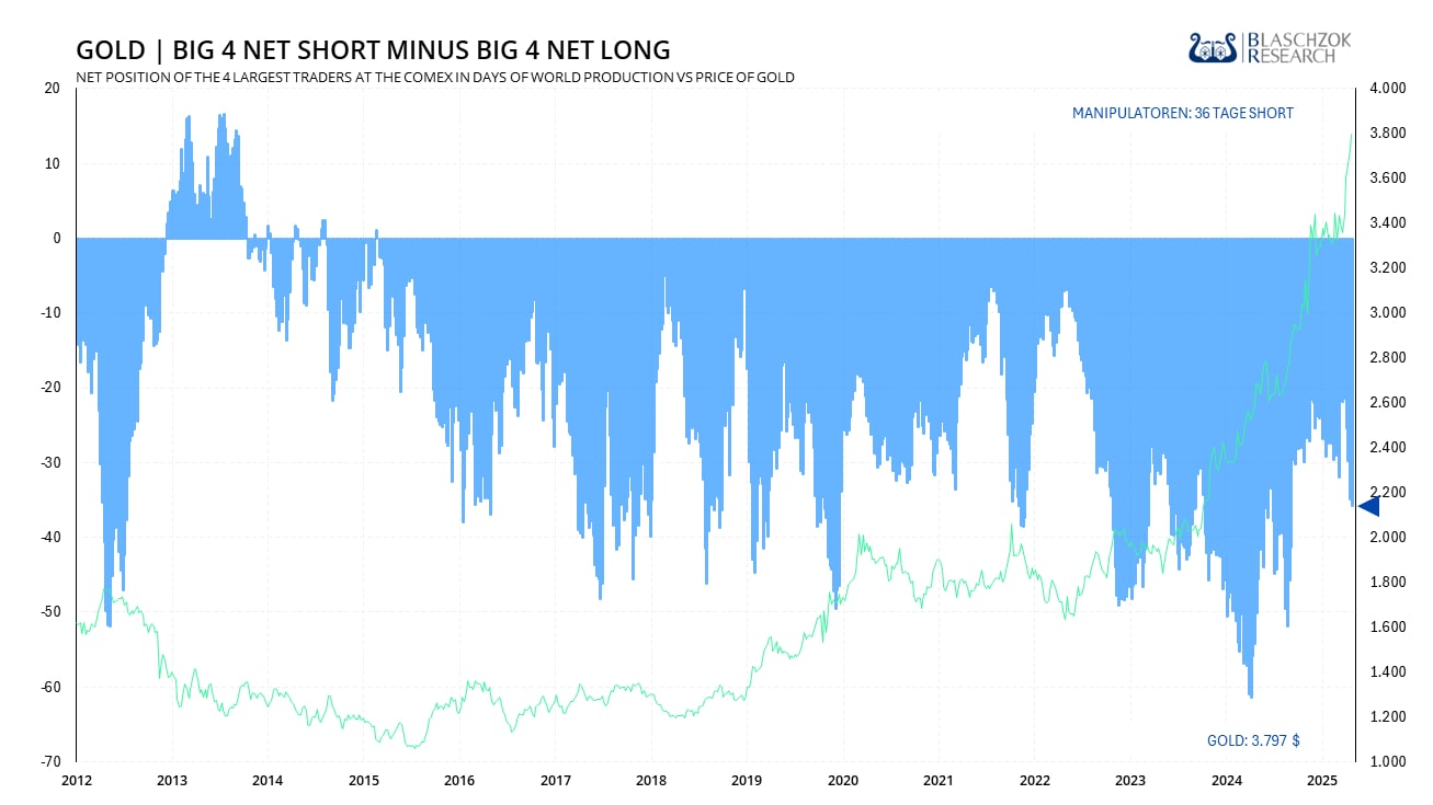 Interessant ist, dass die großen vier Händler am Terminmarkt im letzten Monat ihre Shortposition deutlich ausgeweitet haben – von 21 auf 36 Tage der Weltproduktion. Es scheint, dass man im Bereich um 4.000 US-Dollar ein zyklisches Hoch erwartet und dagegen wettet. Sollten die CoT-Daten weiterhin Stärke zeigen, muss man davon ausgehen, dass nach einer Konsolidierung auf diesem hohen Niveau über Wochen oder Monate ein weiterer Preisanstieg folgen könnte. Kurzfristig dürfte jedoch bei 4.000 US-Dollar zunächst ein Deckel drauf sein und der Goldpreis eher seitwärts handeln – auch wenn dieser CoT-Report noch Stärke zeigt. Das Potenzial für einen Long-Drop am Terminmarkt, der für eine stärkere Preiskorrektur sorgt, ist unvermindert gegeben, auch wenn die Daten besser sind als noch vor einem Jahr.