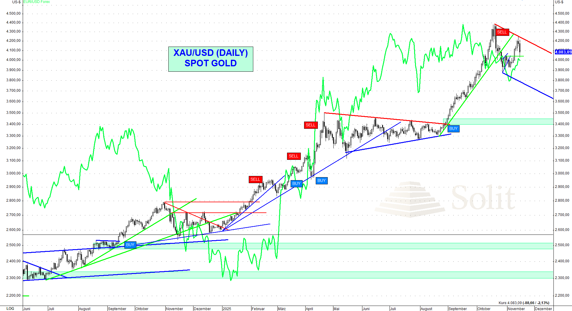 Kurzfristig versuchen wir im Trading weiter zu shorten, mit einem Ziel bei etwa 3.800 US-Dollar bis 3.750 US-Dollar, wo wir im Daytrading alle Short-Positionen schließen würden. Bullisch würde das Chartbild erst wieder werden, wenn es dem Goldpreis gelingt, das Hoch der letzten Woche bei 4.250 US-Dollar zu überwinden. In diesem Fall dürfte das Allzeithoch bei 4.400 US-Dollar angelaufen werden, wo sich schließlich entscheidet, ob sich die Rallye weiter fortsetzt.