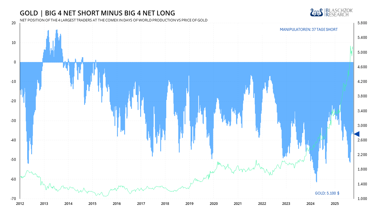 Der kurzfristige Aufwärtstrend bei Gold in Euro verläuft aktuell bei rund 4.100 € je Feinunze. Es ist durchaus wahrscheinlich, dass dieser zunächst getestet wird. Sollte dieser Trend brechen, wäre der Weg frei bis zur 200-Tage-Linie im Bereich von etwa 3.500 € oder im Extremfall bis zum langfristigen Aufwärtstrend bei rund 3.300 €. Eine solche Entwicklung dürfte jedoch nicht abrupt erfolgen, sondern sich eher im Verlauf der kommenden Monate bis zum Jahresende entfalten.