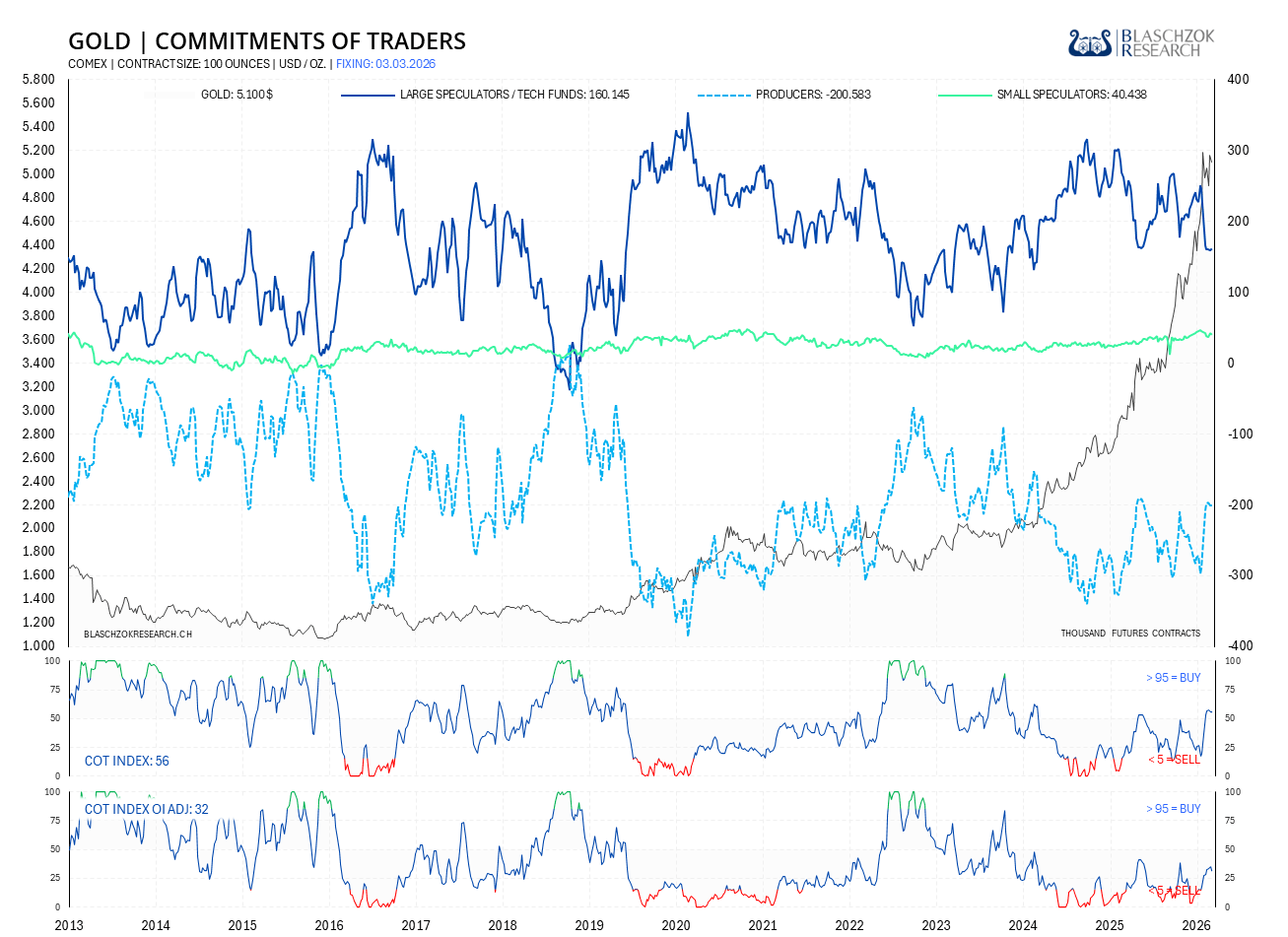 Der Goldpreis fiel zur Vorwoche um 61 US-Dollar, während der CoT-Index zum Open Interest adjustiert um 3 Punkte fiel. Das zeigt eine Schwäche in der letzten Woche.