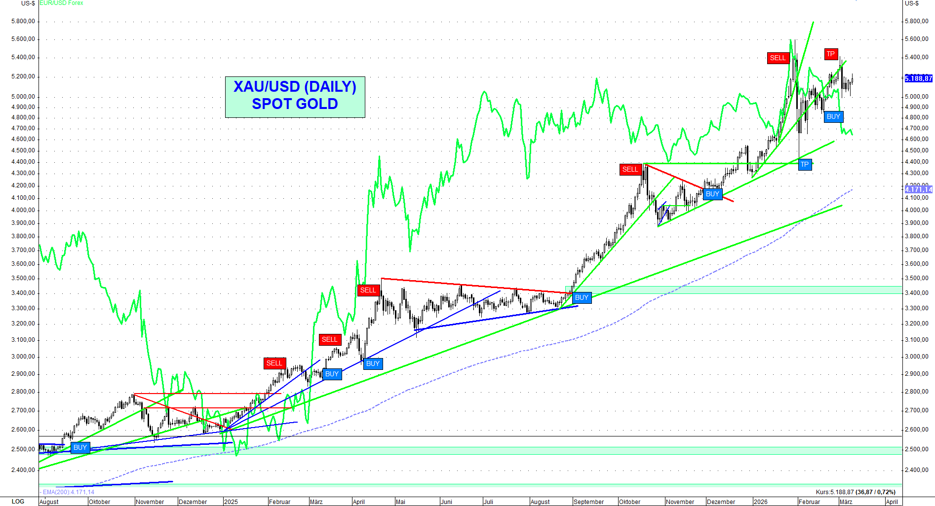 Der Goldpreis stieg vorletzte Woche noch einmal auf über 5.400 US-Dollar, fiel jedoch mit dem Ausbruch des Krieges überraschend auf rund 5.000 US-Dollar zurück, womit die meisten Marktteilnehmer nicht gerechnet hatten. Ich hatte meinen Premium-Kunden gesagt, dass man an dieser Zielzone Long-Gewinne einstreichen und Short gehen sollte, was uns nun wieder auf der Shortseite einen schönen Profit brachte.