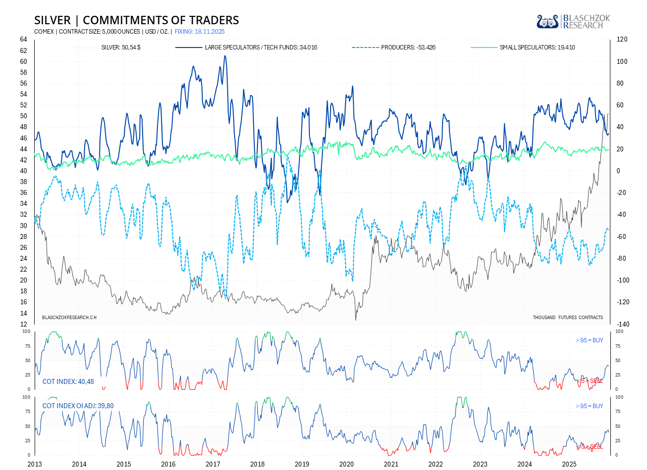 Trotzdem ist die Kernaussage für die kurzfristige Einordnung relevant: Das Niveau um 50 US-Dollar sollte selbst bei einem Rücksetzer als solide Unterstützungszone dienen, weil dort die Investmentnachfrage zuletzt sichtbar stark war. Die Gefahr eines abrupten Long-Drops am Terminmarkt ist geringer, als man nach einer so dynamischen Rallye vermuten könnte. In der Summe ist das kurz- bis mittelfristig ein bullischer CoT-Report, so wie er uns mit Stichtag 18. November vorliegt.