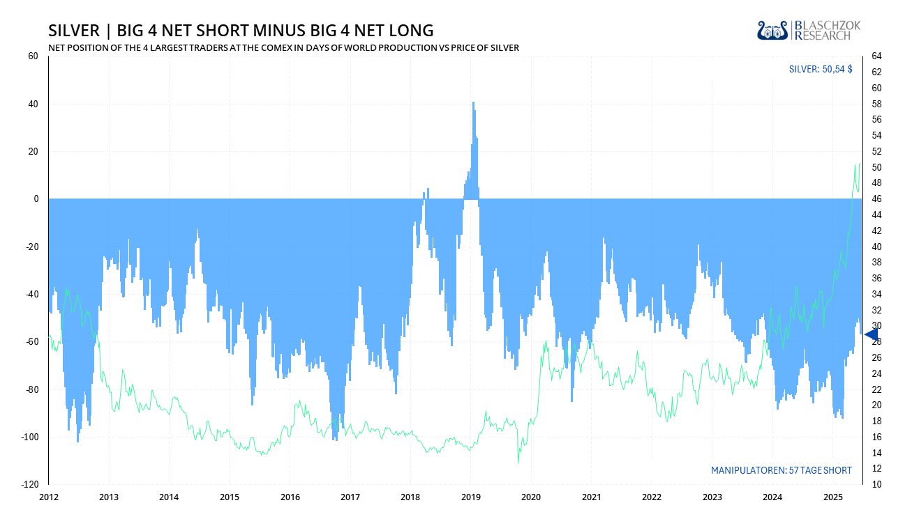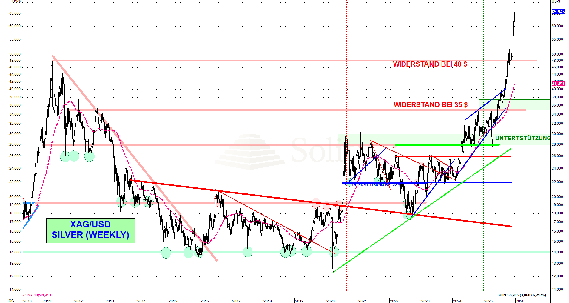 Spätestens dann, wenn der Goldpreis wichtige Unterstützungen bricht und deutlich korrigiert, dürfte auch die Silberrallye enden. Solange das nicht passiert und sich der Goldpreis unterhalb seines Allzeithochs im Bereich um 4.400 US-Dollar stabil hält, kann sich der Squeeze im Silbermarkt fortsetzen. In dieser Phase will man keinen weiteren Anstieg um 10 US-Dollar oder 20 US-Dollar verpassen. Deshalb ist es sinnvoll, die Stopps konsequent nachzuziehen und die Rallye zunächst laufen zu lassen. Niemand weiß, welche Meldungen als Nächstes über den Ticker kommen und Gold und Silber weiter nach oben treiben.