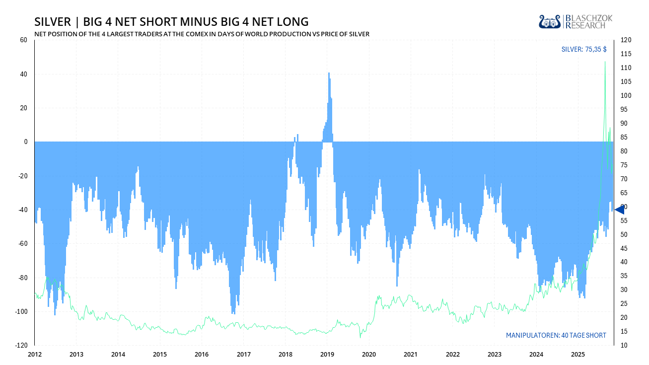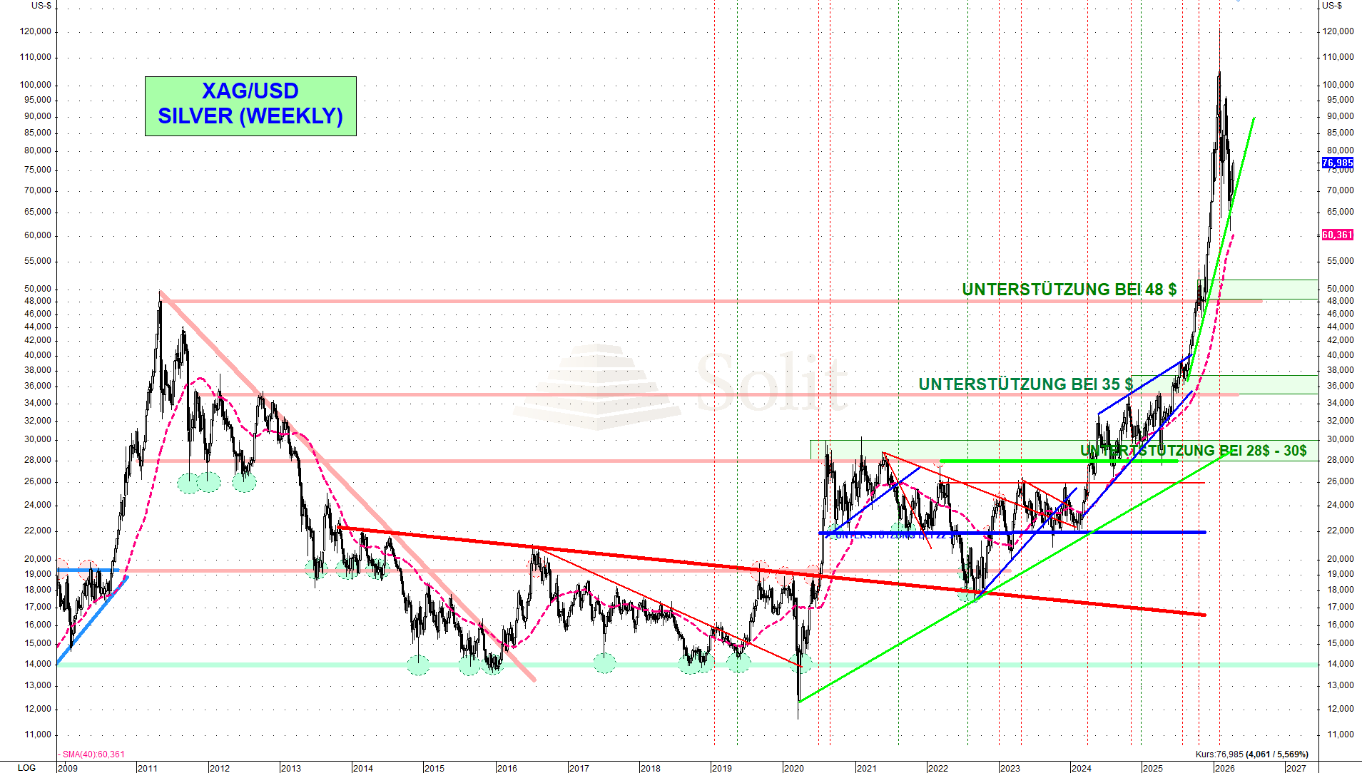 Nach einer solchen Korrektur und einer vollständigen Bereinigung am Terminmarkt würden wir mittel- bis langfristig wieder klar bullisch werden. Entsprechende Rücksetzer wären dann als antizyklische Kaufchancen zu werten, da der Silbermarkt langfristig weiterhin erhebliches Potenzial auf der Oberseite bietet.