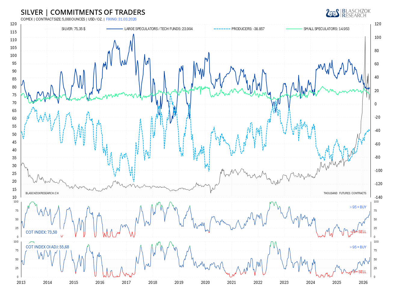 Der Silberpreis stieg in der letzten Woche um 3,40 $ an, während sich der COT-Index verbessert hat. Das zeigt in der letzten Woche eine deutliche Stärke nach dem vorherigen Abverkauf. Käufer sind in den Markt gekommen und haben den Rücksetzer gekauft. Auf Monatssicht sehen wir einen Preisrückgang um 7 $, während sich der COT-Index um 16 Punkte auf 73 Punkte verbessert hat. Auch der COT-Index zum Open Interest hat sich deutlich verbessert auf 56 Punkte. Damit sehen wir seit einem Monat eine gewisse Stabilisierung, obwohl der Preis moderat gefallen ist. Ein COT-Index von 73 Punkten ist relativ bullisch, während der COT-Index zum Open Interest mit 56 Punkten lediglich neutral ist. Es besteht also weiterhin Abwärtspotenzial, wenn sich die Stimmung weiter eintrübt. Stark überverkauft ist der Silbermarkt aktuell nicht mehr, trotz des erhöhten Preisniveaus. Sollte sich die wirtschaftliche Stimmung verschlechtern und es zu Abflüssen aus ETF-Beständen kommen, könnte dies zu einem Überangebot führen und eine weitere Schwäche am Terminmarkt nach sich ziehen. Die Terminmarktdaten fallen insgesamt besser aus als erwartet, zeigen aber gleichzeitig weiterhin strukturelle Schwäche seit dem Hoch bei 122 $. Der Preis ist im Tief bereits um rund 50 % gefallen und der COT-Index zum Open Interest bleibt neutral, was zeigt, dass die vorherige spekulative Übertreibung weiter abgebaut wird. Insgesamt zeigen die Daten Licht und Schatten. Einerseits sehen wir im letzten Monat eine gewisse Stärke, andererseits zeigt sich seit dem Hoch in den letzten zwei bis drei Monaten eine anhaltende Schwäche, die sich nach der aktuellen Stabilisierung wieder fortsetzen könnte.