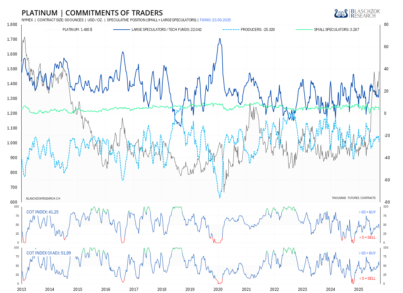Der Platinpreis stieg zur Vorwoche um 80 US-Dollar an, während die Spekulanten in der gleichen Zeit mit 4 Tsd. Kontrakten Long gingen. Der CoT-Index hat sich dementsprechend um 10 Punkte auf 51 Punkte verschlechtert und ist nun wieder neutral.