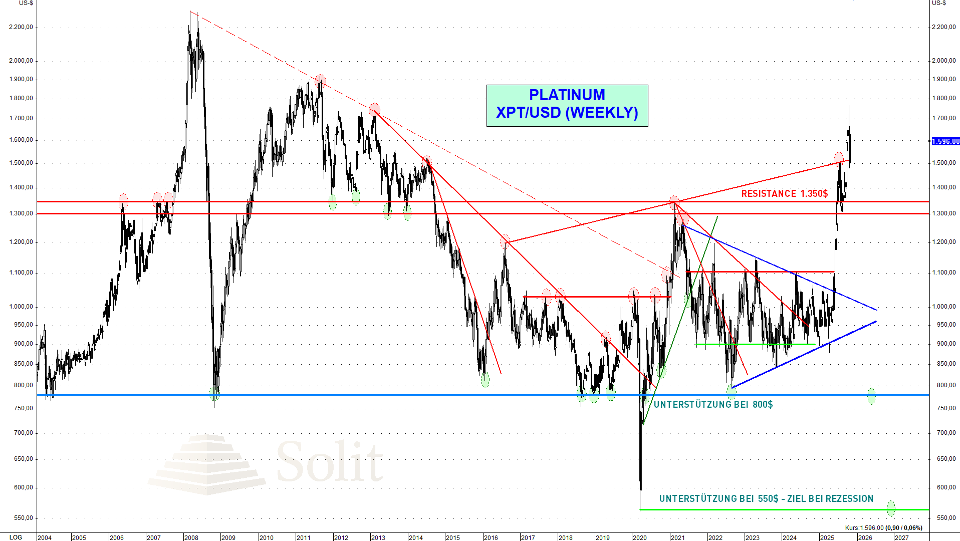 Chancen für den Platinpreis böten sich bei einer spürbaren Angebotsverknappung. Da die Investmentnachfrage zuletzt so stark anstieg, sehen wir hier einen Faktor, der den Platinpreis nachhaltig stützen könnte in den kommenden Jahren. Mit der Stagflation wird es eine Flucht in reale harte Vermögenswerte geben, die auch den Preis für Platin weiter anheizen wird, selbst dann, wenn es fundamental unbegründet ist. Eine Korrektur bis in den Bereich von 1.000 US-Dollar bis 1.350 US-Dollar sehe ich daher als eine langfristige gute Kaufchance.