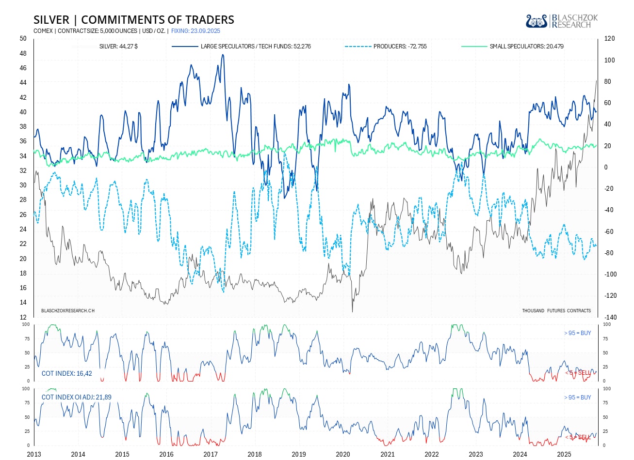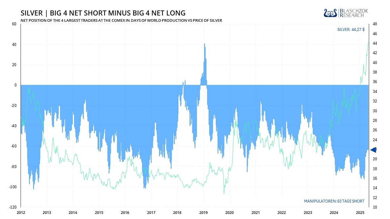 Die Terminmarktdaten sind weiterhin stark überkauft, ähnlich wie vor über einem Jahr, allerdings liegt der Preis mittlerweile deutlich höher. Solange der Goldpreis stark bleibt, kann Silber weiter steigen und es besteht die Möglichkeit, dass es zu einem Short Squeeze bei den BIG 4 an der COMEX kommt. Diese haben in der letzten Woche ihre Shortposition um drei Tage der Weltproduktion ausgeweitet.
