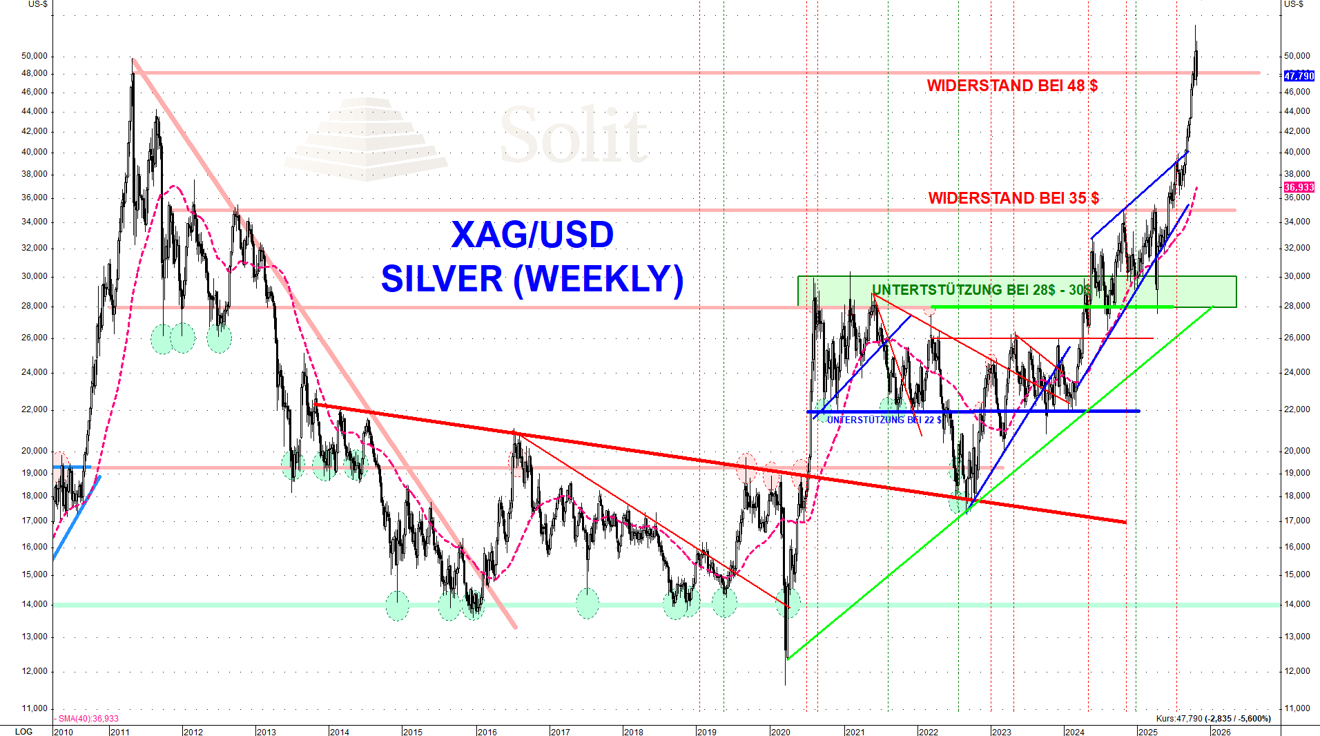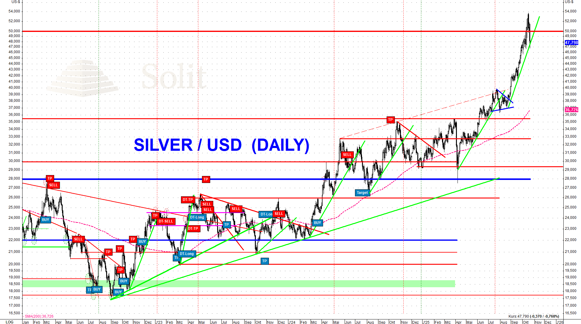 Mit dem Hoch am Silbermarkt bei 54 US-Dollar konnten wir ein Verkaufssignal bzw. eine Empfehlung zur Gewinnmitnahme geben, da sich zeitgleich am Goldmarkt ein Doppeltop abzeichnete. Der historisch starke Preisrückgang zu Wochenbeginn führte auch beim Silberpreis zu einem Rückgang von rund 9 %, wobei weiterhin Abwärtspotenzial besteht. Sollte der Goldpreis seinen Aufwärtstrend brechen und unter 4.000 US-Dollar fallen, wäre eine Folgekorrektur bis in den Bereich von 3.500 US-Dollar möglich und damit auch beim Silberpreis eine Bereinigung der spekulativen Übertreibung. Ein Rücksetzer in den Bereich zwischen 38 US-Dollar und 35 US-Dollar wäre in diesem Fall durchaus realistisch.